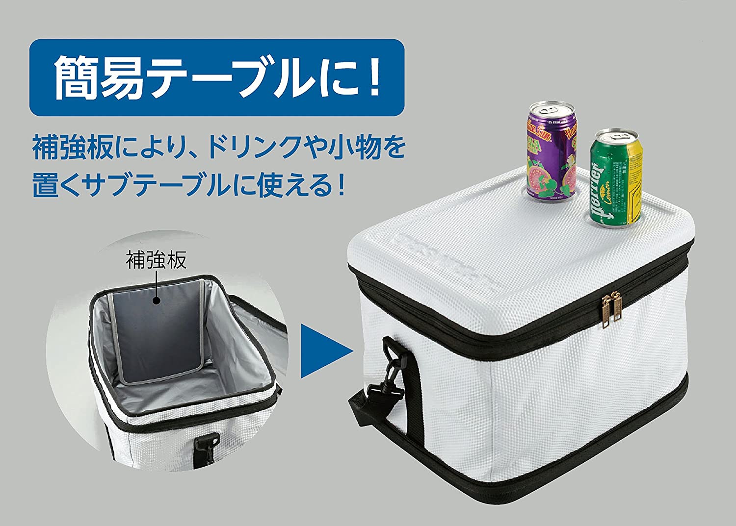 内面の補強板により、ドリンクや小物を置くサブテーブルとしても使用可能。