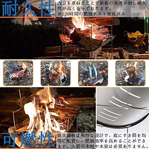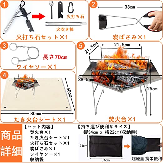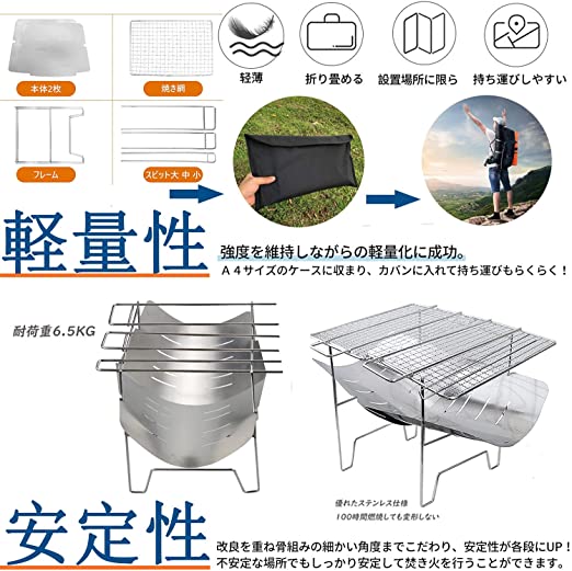 • 【焚火台】本製品は耐久性に適したステンレスで作られています。サイズ 収納時 34㎝×24㎝ 本体重量 965g。カバンにすっぽり入り、登山、遠足、キャンプあらゆるアウトドアシーンに最適です。 【簡単組み立て】誰でも簡単に約15秒程度で組み立てられるように設計された焚き火台です。また持ち運びが楽な軽さで折りたたんで収納が可能です。従来品に比べて骨組みの角度など細部までこだわりより安定性が向上しております。不安定な場所でも安心して使用していただけます。【一台多役】焚火台として:バーベキュー網を外して薪を燃やせば、焚き火台としても全然大丈夫です。