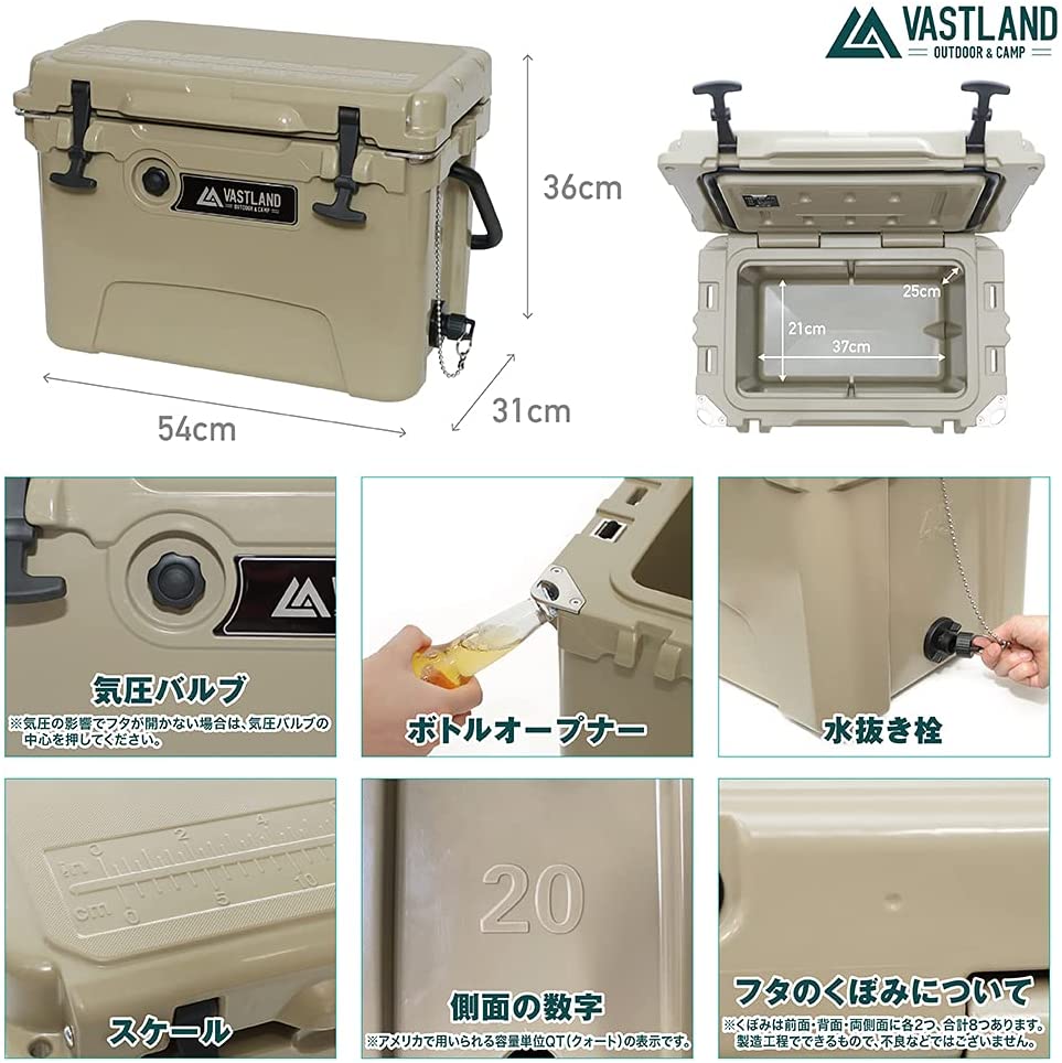 - その他「水抜き栓」や「ボトルオープナー」、「滑り止め」など様々なシーンで大活躍の魅力がたくさん詰まっています。【利用シーン】キャンプ、アウトドア、バーベキュー、レジャー、釣りなど